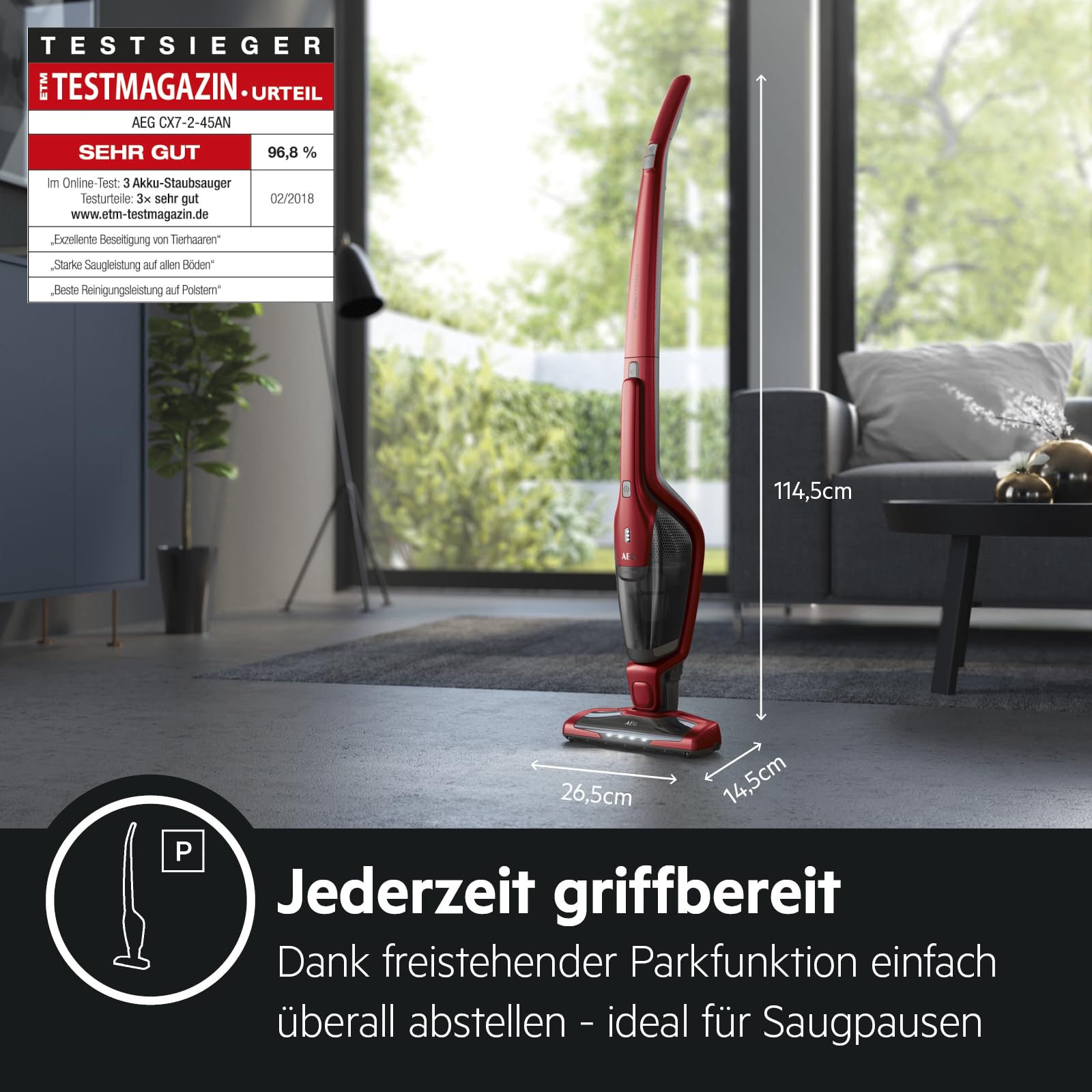 AEG Ergorapido 2in1 Akku-Staubsauger – Beutellos, Tierhaardüse, 45 Min Laufzeit, LED-Frontlicht, Rot