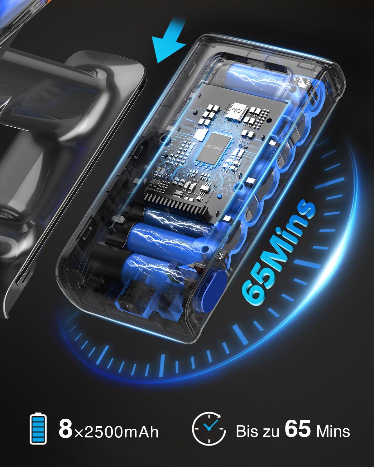 Bis zu 65 Minuten Laufzeit: Leistungsstarker Akku ermöglicht lange Reinigungssitzungen, mit abnehmbarem Design für optionale Zweitakkus. Wandladestation inklusive.