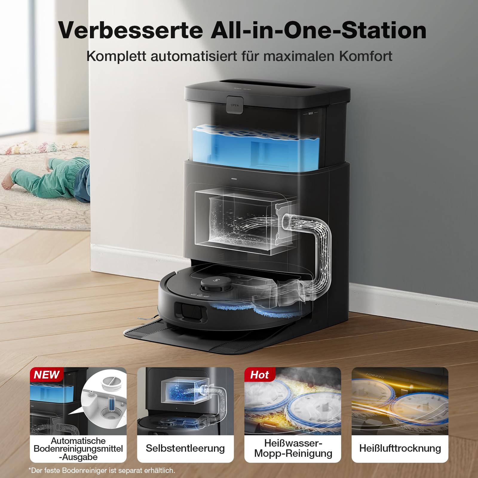 All-in-One OMNI-Station: Automatische Selbstentleerung und Wischmoppreinigung mit 60 °C heißem Wasser. Heißlufttrocknung bei 40 °C verhindert Gerüche. Der 2,6 L Staubbeutel hält bis zu 75 Tage.
