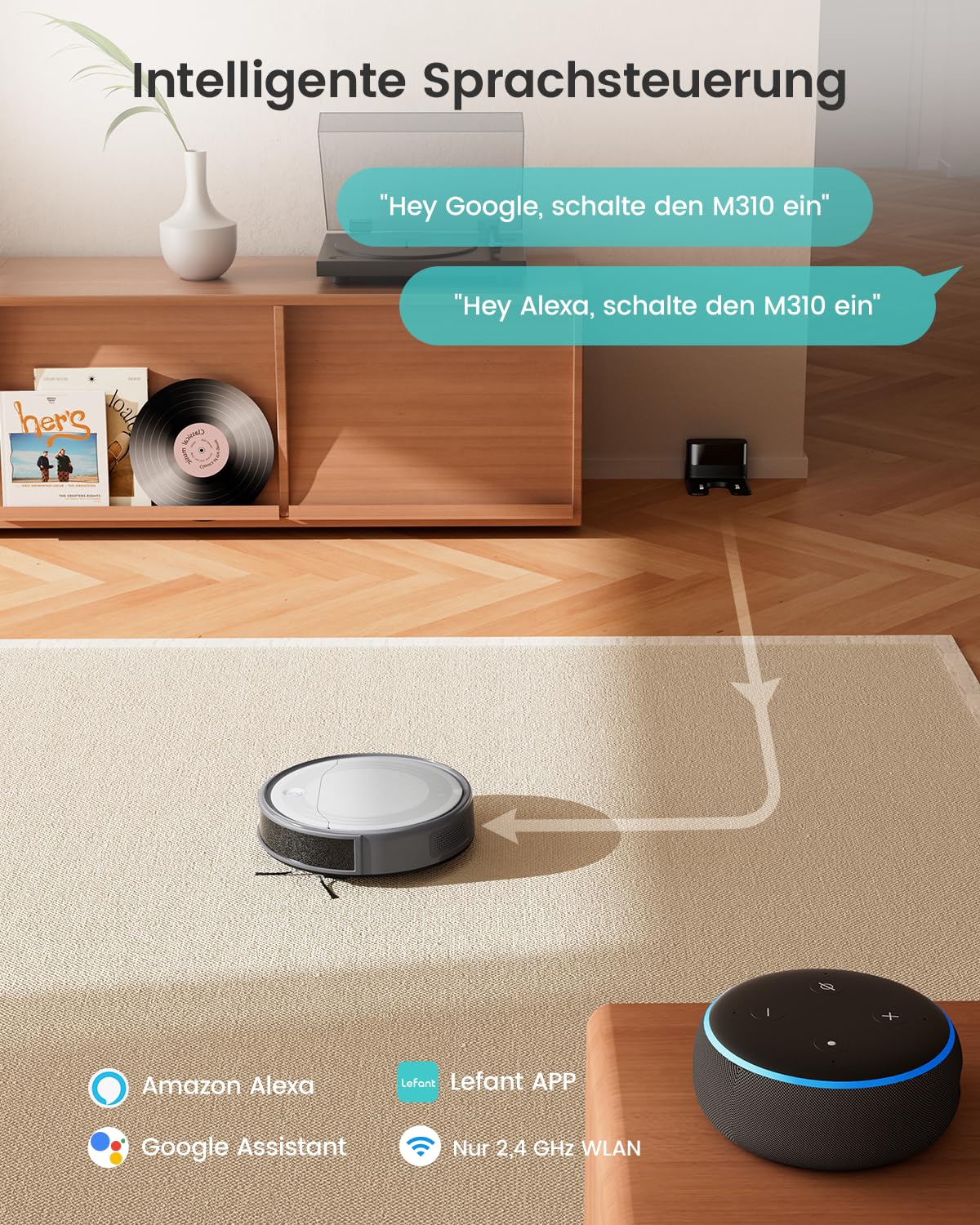 App- & Sprachsteuerung: Über die Lefant-App können Reinigungszeiten, Modi und Saugkraft bequem eingestellt werden. Unterstützt Alexa und Google Assistant für Sprachbefehle. (Nur 2,4 GHz-WLAN)
