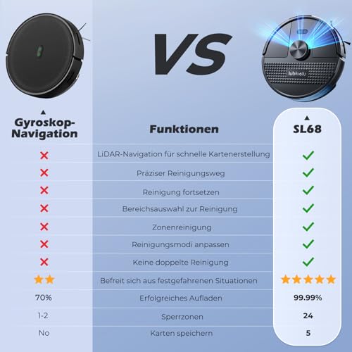 Der Lubluelu SL68 Plus Saugroboter bietet eine leistungsstarke und intelligente Reinigungslösung für Teppiche, Hartböden und Haustierhaare. Mit Absaugstation, LiDAR-Navigation und App-/Sprachsteuerung wird Ihr Zuhause mühelos sauber gehalten.