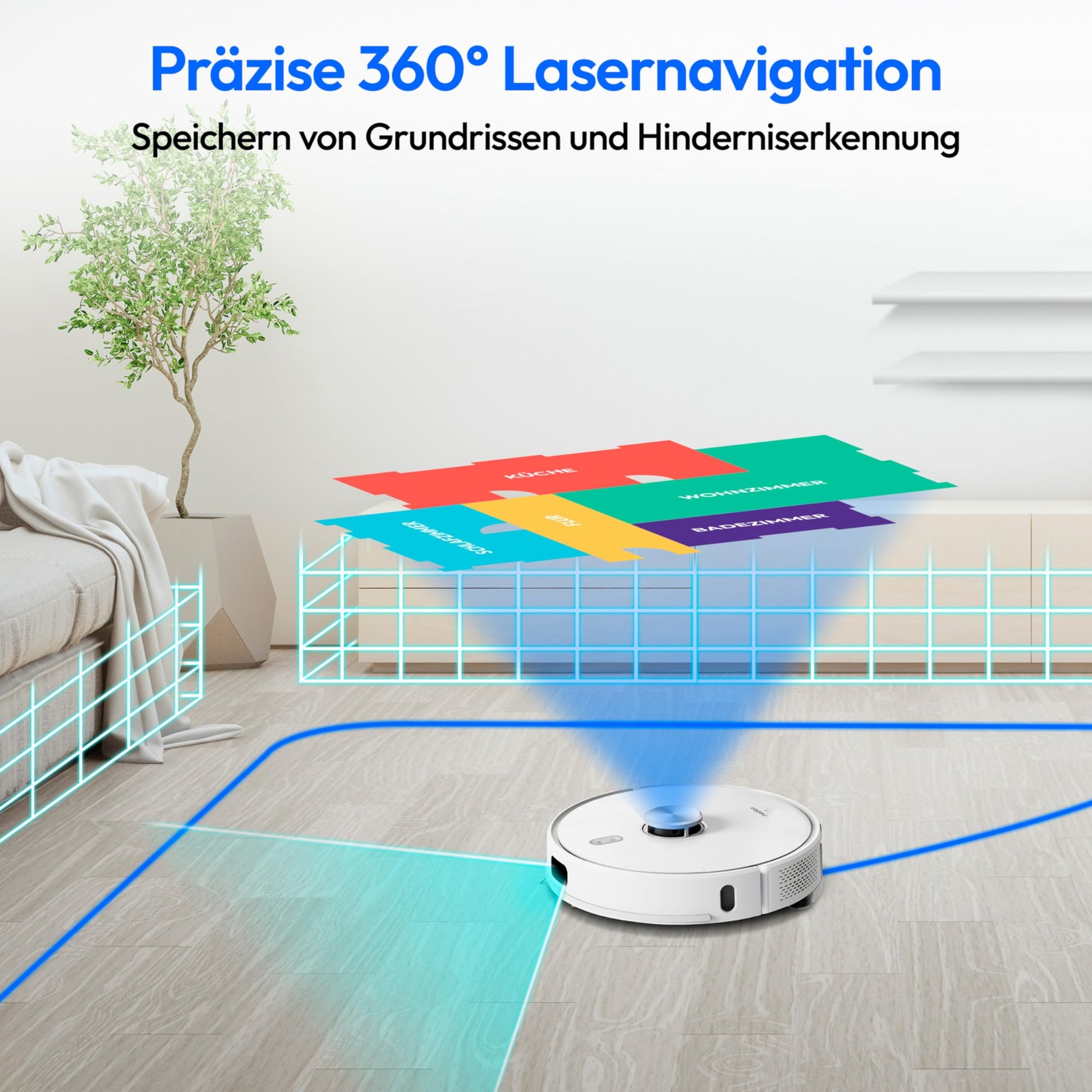 Präzise Laser-Navigation: Kartiert Ihr Zuhause zuverlässig und ermöglicht die Einrichtung von Go- und No-Go-Bereichen.