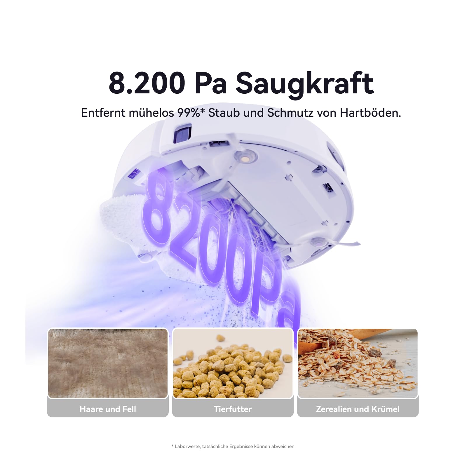 Präzise Hindernisvermeidung: 3D-Strukturlicht-Technologie und seitliche Sensoren umfahren Möbel, kleine Objekte und Kanten, um jede Fläche gründlich zu reinigen.