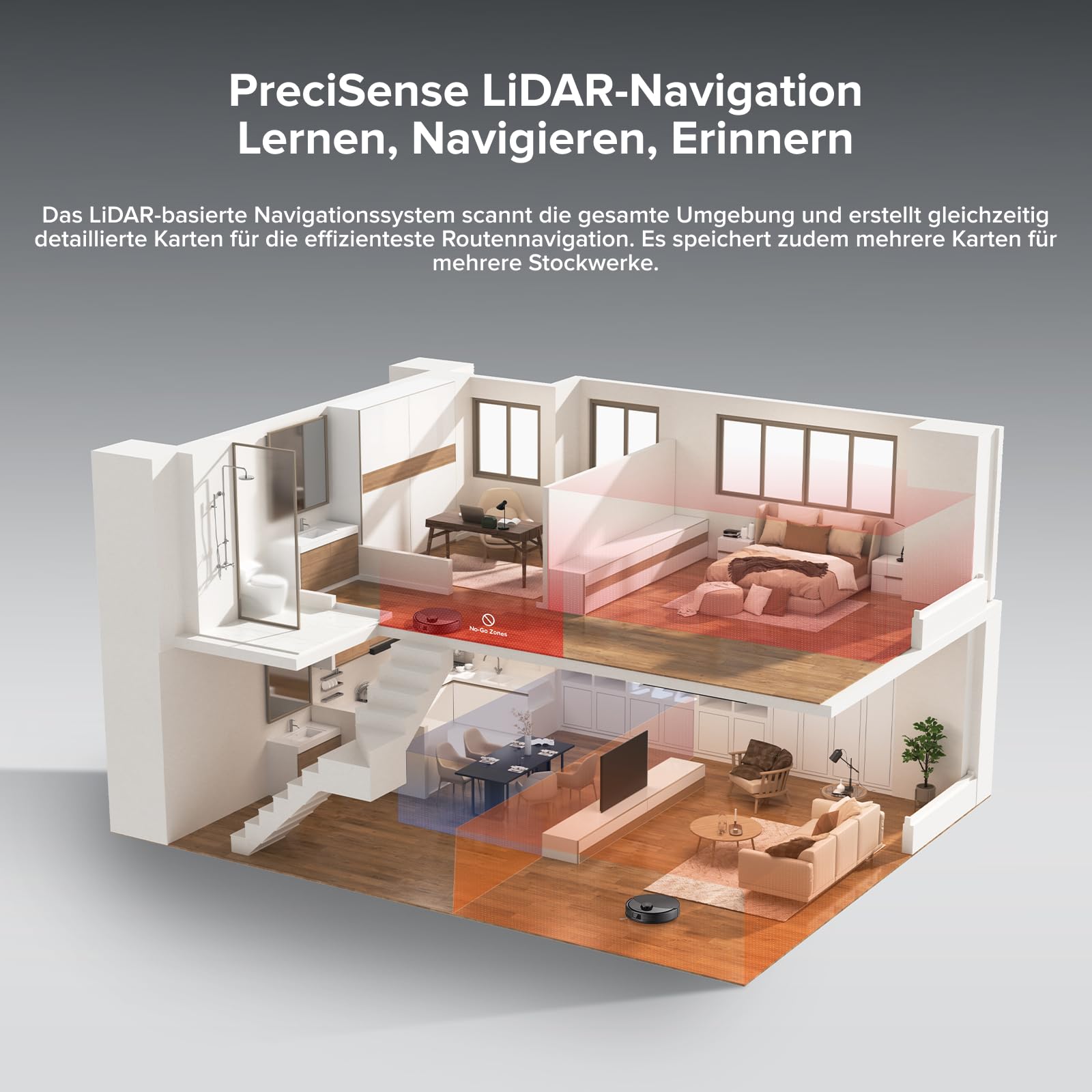 Präzise LiDAR-Navigation: 360°-Scan erstellt detaillierte Karten, speichert mehrere Etagenpläne und ermöglicht No-Go-Zonen für effiziente und lückenlose Reinigung.