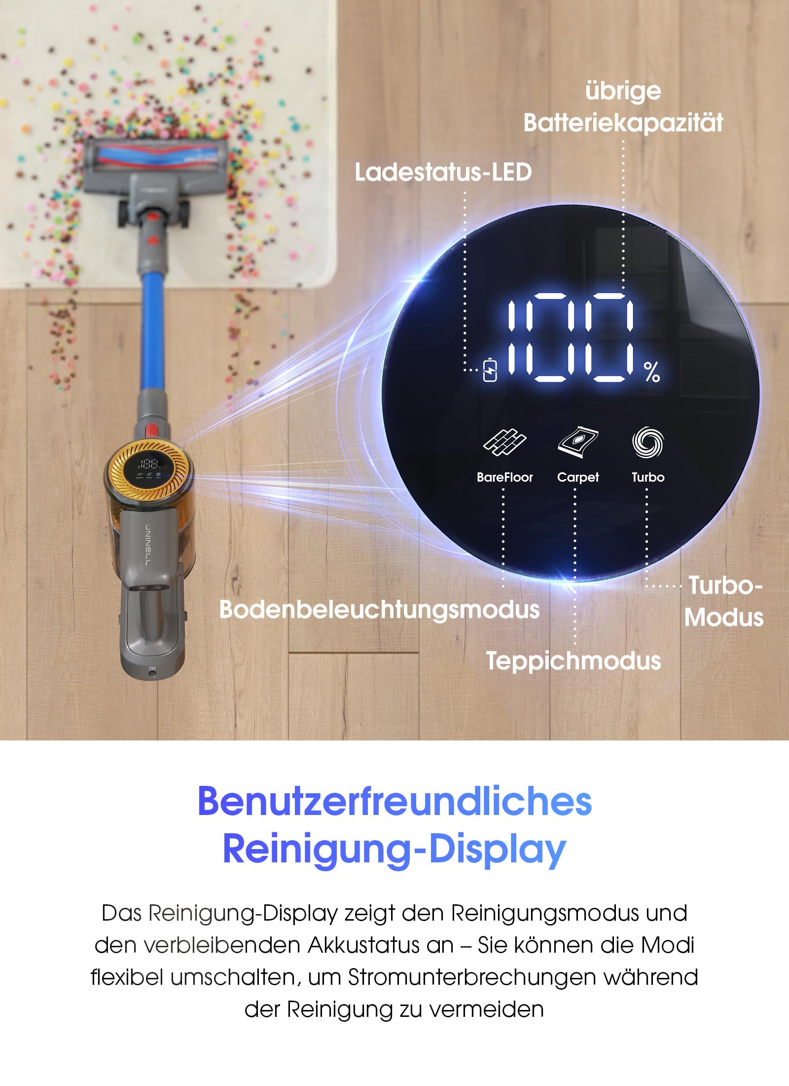Der UNINELL UV1 Akku-Staubsauger vereint kraftvolle Leistung, kabellose Flexibilität und intelligentes Design für eine gründliche Reinigung in Ihrem Zuhause. Ideal für Hartböden, Teppiche, Polster und Tierhaare.