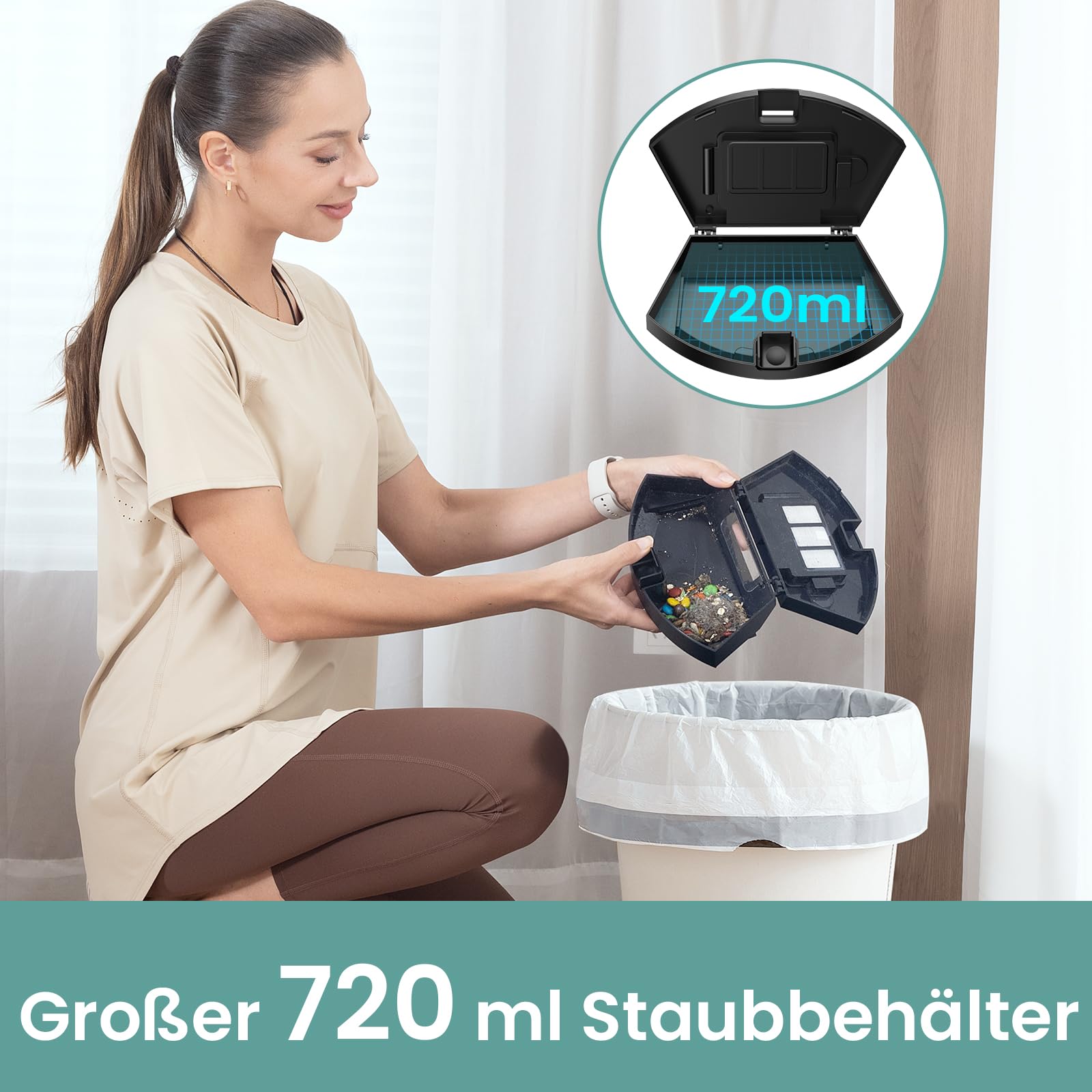 Großer 720 ml Staubbehälter: XL-Kapazität für langanhaltende Reinigung ohne häufiges Entleeren – ideal für große Wohnungen und viel Tierhaare.